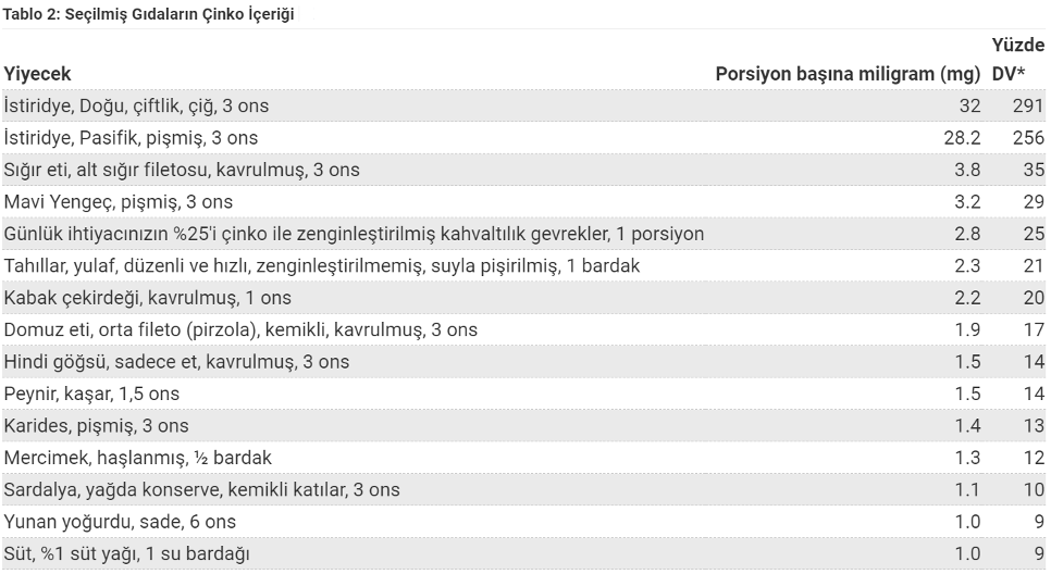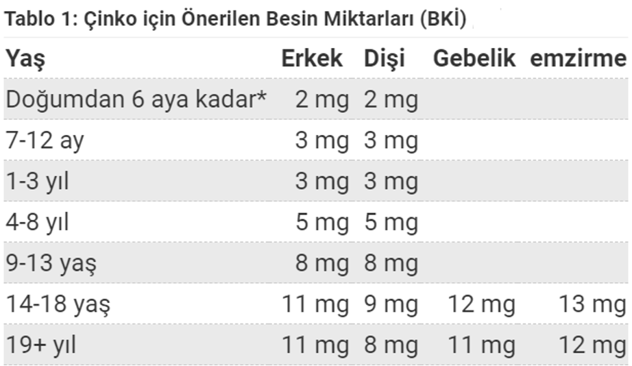 Çinko İçin Günlük Önerilen Alım Miktarı