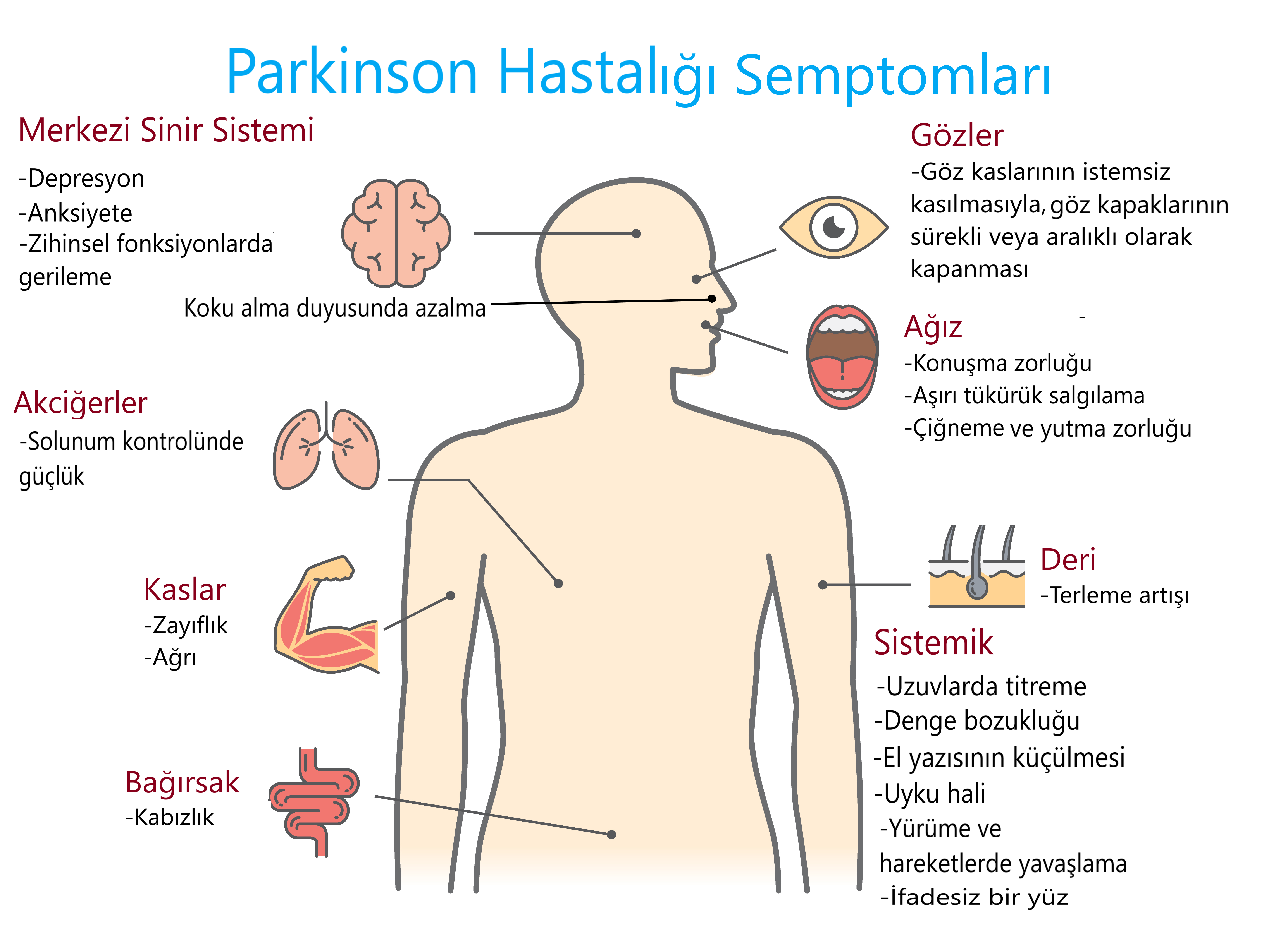 Hastalığın belirtileri 40-70 yaşları arasında, sıklıkla da 60’lı yaşlarda başlar. 65 yaş üzerinde her 100 kişiden birinin Parkinson hastası olduğu kabul edilmektedir. Hastalığın ilerleyen dönemlerinde farklı nöronların da hasarlanması hastalığın; depresyon, uyku bozuklukları, ortostatik hipotansiyon, ürogenital bozukluklar, kabızlık gibi hareketle ilişkili olmayan belirtilerin de ortaya çıkmasına neden olmaktadır.Parkinson hastalığı egzersizleri, bu semptomların hafifletilmesinde etkili olabilir.