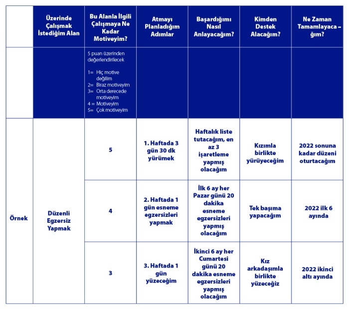 Örnek: Daha iyi bir yaşam için 2022 yılı içerisinde (zamana bağlı) bozulan aile ilişkilerimi düzeltmek (hedefe giderken gitmek istediğimiz özel yol), bunun için eşimle her hafta bir gün baş başa bir organizasyon yapmak ve her pazar günümü eşime ve çocuklarıma ayırmak (ölçülebilir, ulaşılabilir, ama zorlayıcı) istiyorum.