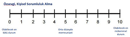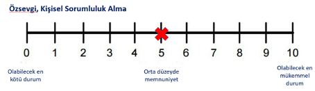 Örneğin..kendinizi ne kadar seviyorsunuz, kendi hayatınız ve sağlığınızla ilgili ne kadar kişisel sorumluluk alıyorsunuz diye size sorsak, kendinize kaç puan verirsiniz? Eğer “orta düzeyde” gibi bir hissediyorsanız buna 5 puan verin ve aşağıdaki gibi işaretleyin.