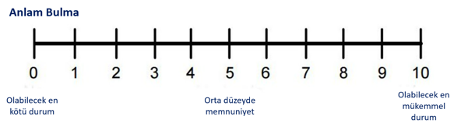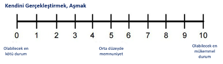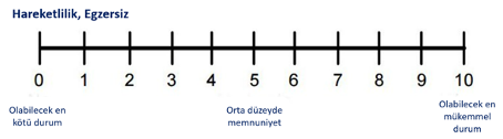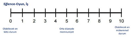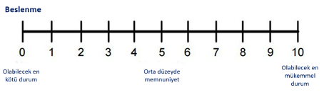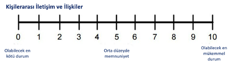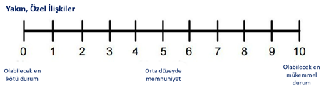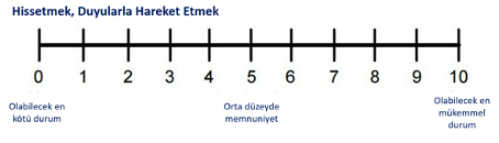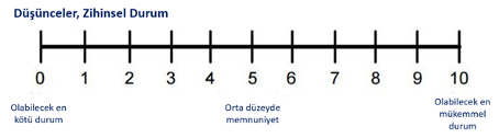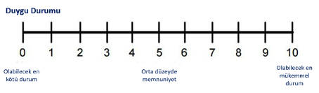 Bu değerlendirmeyi 10 puan üzerinden yapın. Bir başlıkta kendinizi çok mutsuz hissediyorsanız lütfen o başlıktaki puanınızı 0 puan olarak işaretleyin, orta halli hissediyorsanız 5 puan, eğer o başlıkta kendinizi mükemmel hissediyorsanız da 10 puan olarak işaretleyin. Ya da aradaki puanlara mevcut durumunuzu daha yakın hissediyorsanız hissettiğiniz puanı verin (örneğin orta ile iyi arasında hissediyorsanız 7 puan gibi bir puan verin).